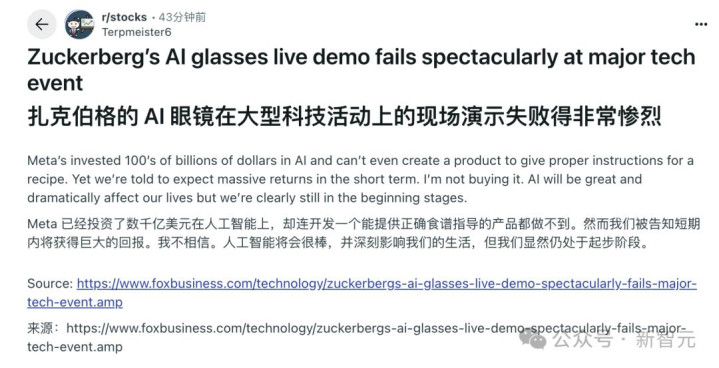 有网友认为,这次演示失败,表明Meta智能眼镜产品还处于早期阶段。
