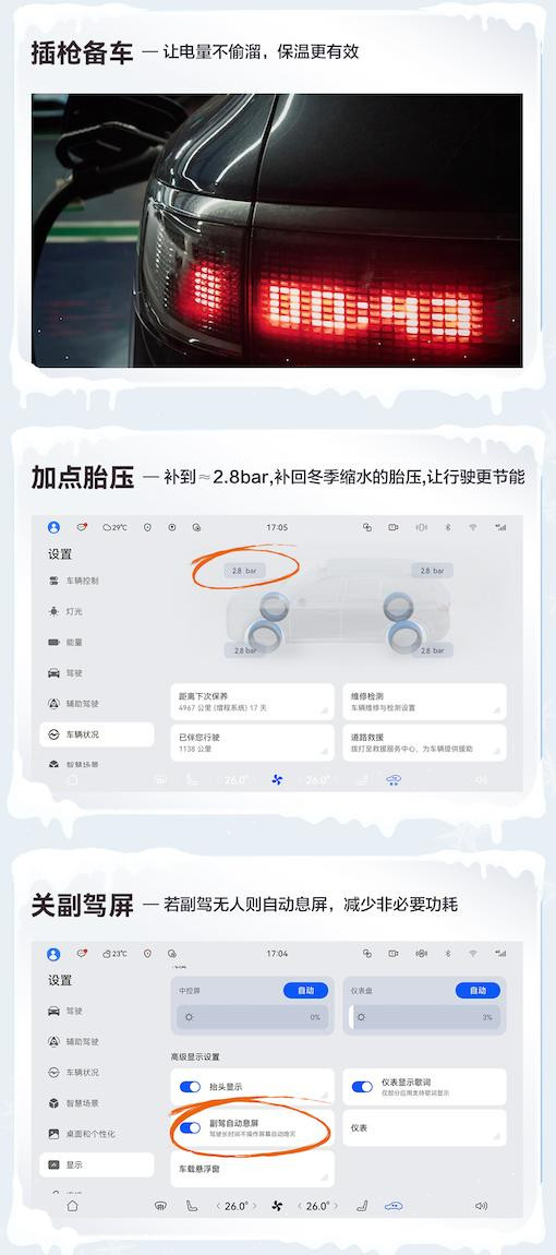 冬季出行节能第一步,从发车前的细致准备开始。用户可在出发前开启问界 M8 的 “插枪备车” 功能,通过插电保温维持电池温度,让电池在低温环境下依旧保持活性、减少容量衰减,从而提升充电效率、延长续航,还能提前温暖座舱,避免上车后空调高功率运转造成额外耗电。针对冬季低温导致的胎压缩水、增加行驶能耗的问题,用户可将胎压补至 2.8bar 左右,让行驶更节能。