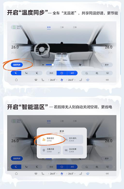 在此基础上,多种智能控温模式可针对不同出行场调控,实现舒适与节能兼顾的出行体验。当全家出行时,开启 “温度同步”功能,利用四温区系统的协同能力,全车可共享舒适温度,避免多温区分控的能耗增加;独自出行时,切换 “智能温区”功能,后排会自动关闭对应空调,让暖风 “按需供应”;再加上 0 - 100% 内循环比例的智能调节,搭配三源热泵技术,实现了暖舱效率与能耗的完美平衡。此外,座椅加热、7.3L车载冷暖箱等配置,让冬季座舱的温暖体验更上一层楼。