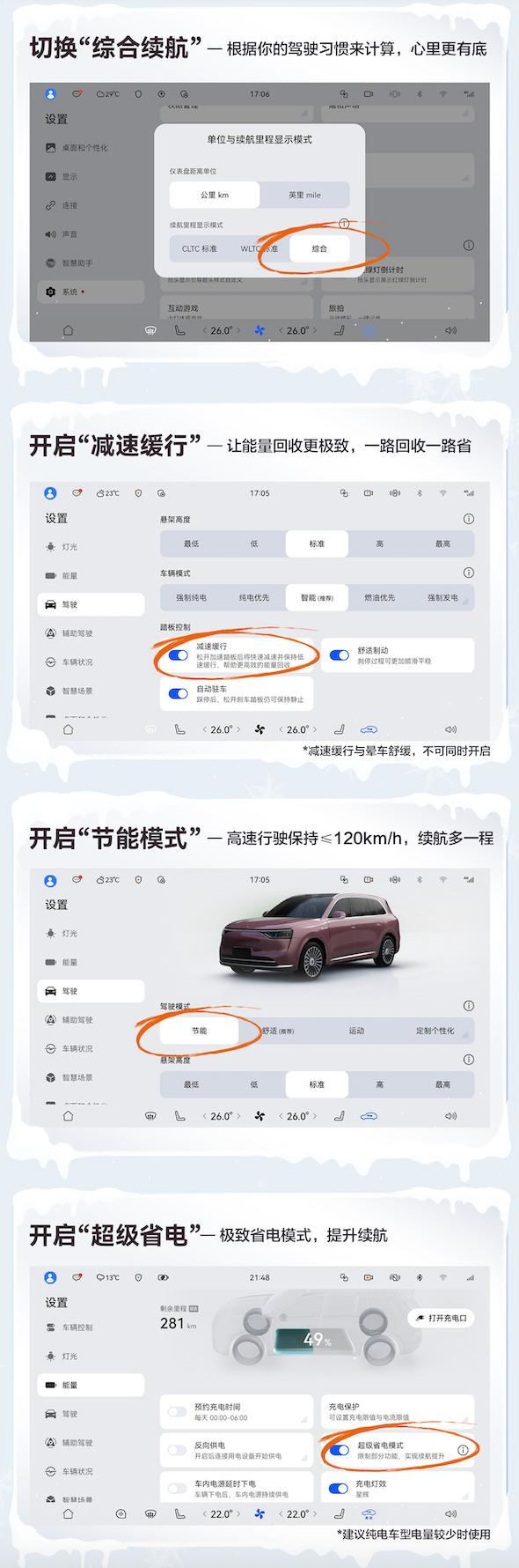 日常出行时,开启“综合续航” 模式,系统会结合用户过往驾驶习惯,计算出贴合实际的续航里程,让用户精准掌握车辆续航状况;城市拥堵路段行驶时,开启“减速缓行”功能,用户松开油门后,车辆快速减速并保持低速缓行,在此期间,车辆可实现更高效的能量回收,从而拉长实际续航;长途驾驶且路况良好时,可以切换至 “节能模式”,车速稳定保持≤120km/h,减少急刹、频繁超车产生的额外能耗,有效提升车辆续航;纯电版电量较低时,可开启 “超级省电” 模式,车辆会通过限制部分功能降低能耗,实现续航里程的显著提升。